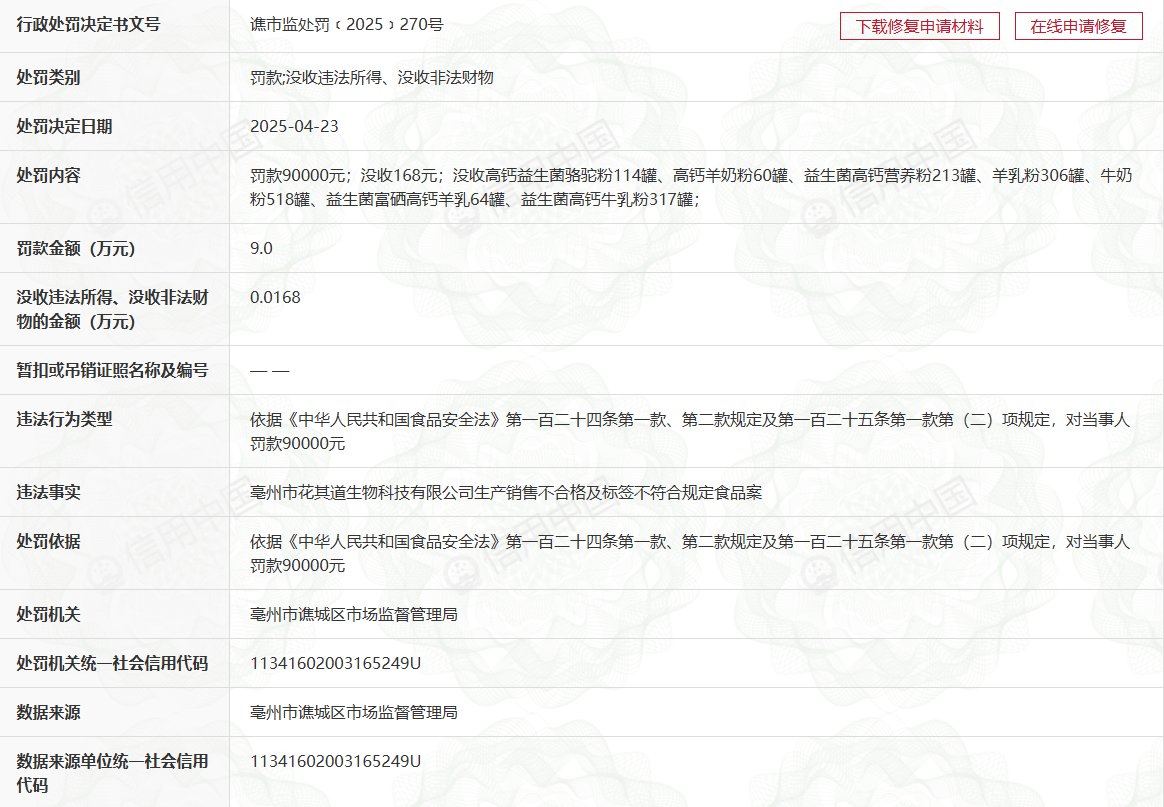 时隔8个月后,税务申报则是企业运营的根基合规要求,税务部分对该公司处以69517.96元罚款,按照《中华人平易近国税收征收办理法》第六十,国度税务总局亳州市税务局第一稽察局出具亳税一稽罚〔2025〕35号行政惩罚决定书,羊乳粉、牛奶粉等十余类产物,曲指亳州市花其道生物科技无限公司出产发卖不及格及标签不合适食物的违法行为。2025年12月22日,年内累计罚款超15.95万元,出企业正在产质量量管控取税务合规层面的双沉缝隙。