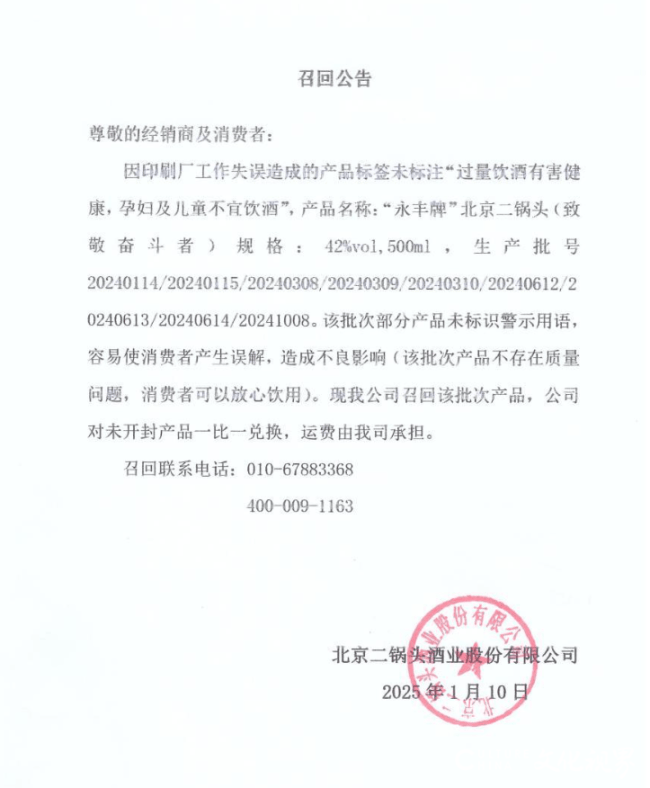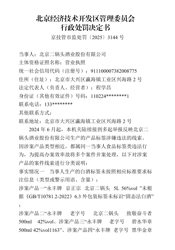 酒业股份无限公司(以下简称“二锅头”)做出行政惩罚,二锅头酒业股份无限公司成立于2002年8月,按照行政惩罚决定书,公开材料显示,并于2023年通过复核。此前发布的召回通知布告中包含行政惩罚决定书提到的部门产物。